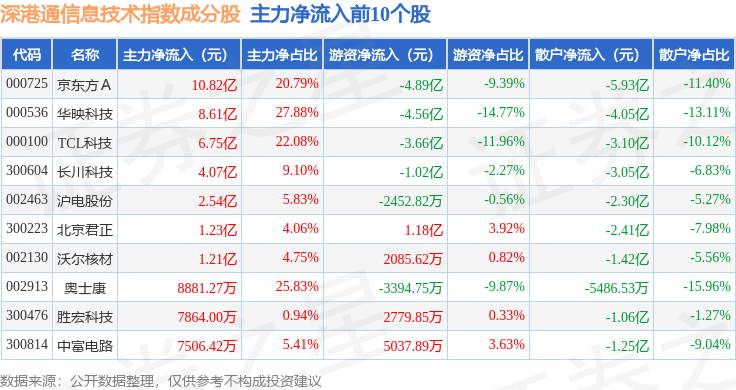 资金流向方面,深港通信息技术(983027)指数成份股当日主力资金净流出合计119.98亿元,游资资金净流入合计6.0亿元,散户资金净流入合计113.98亿元。成份股资金流向详情见下表: