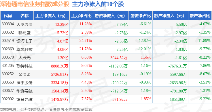 资金流向方面,深港通电信业务(983029)指数成份股当日主力资金净流出合计31.04亿元,游资资金净流入合计7.86亿元,散户资金净流入合计23.19亿元。成份股资金流向详情见下表: