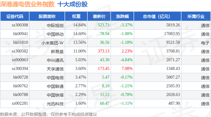 深港通电信业务(983029)指数十大成份股详情如下: