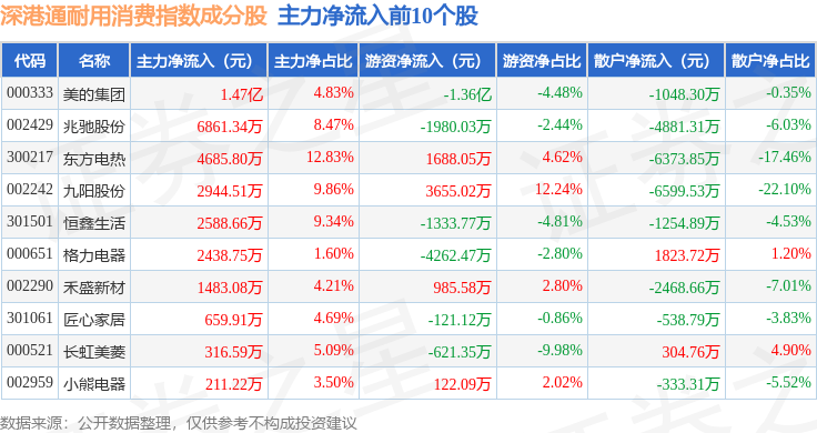 资金流向方面,深港通耐用消费(983049)指数成份股当日主力资金净流出合计6.57亿元,游资资金净流出合计9730.38万元,散户资金净流入合计7.54亿元。成份股资金流向详情见下表: