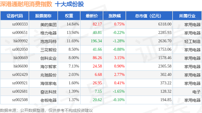 深港通耐用消费(983049)指数十大成份股详情如下: