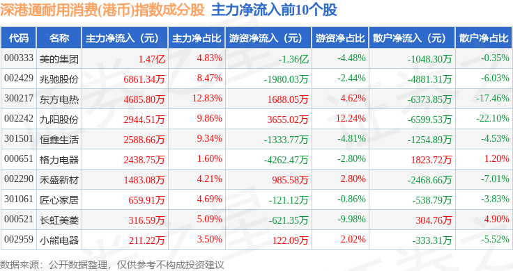 资金流向方面,深港通耐用消费(港币)(983050)指数成份股当日主力资金净流出合计6.57亿元,游资资金净流出合计9730.38万元,散户资金净流入合计7.54亿元。成份股资金流向详情见下表: