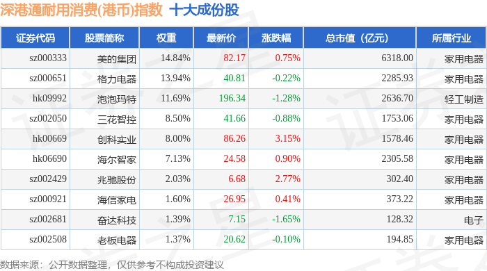 深港通耐用消费(港币)(983050)指数十大成份股详情如下: