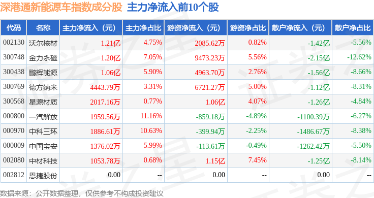 资金流向方面,深港通新能源车(983087)指数成份股当日主力资金净流出合计46.96亿元,游资资金净流入合计9.32亿元,散户资金净流入合计37.64亿元。成份股资金流向详情见下表: