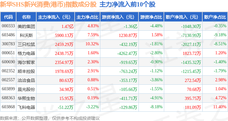 资金流向方面,新华SHS新兴消费(港币)(989007)指数成份股当日主力资金净流出合计11.6亿元,游资资金净流入合计9497.32万元,散户资金净流入合计10.65亿元。成份股资金流向详情见下表: