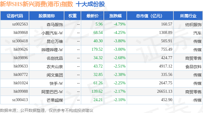 新华SHS新兴消费(港币)(989007)指数十大成份股详情如下: