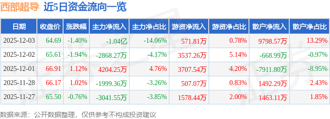 12月3日的资金流向数据方面,主力资金净流出1.04亿元,占总成交额14.06%,游资资金净流入571.81万元,占总成交额0.78%,散户资金净流入9798.57万元,占总成交额13.29%。