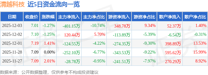 证券之星消息,截至2025年12月3日收盘,清越科技(688496)报收于7.01元,下跌1.27%,换手率2.23%,成交量5.3万手,成交额3735.18万元。