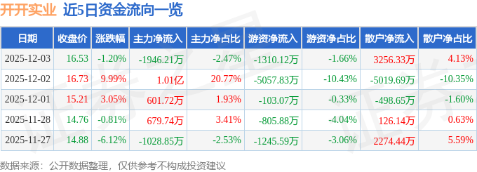 证券之星消息,截至2025年12月3日收盘,开开实业(600272)报收于16.53元,下跌1.2%,换手率28.53%,成交量45.65万手,成交额7.88亿元。