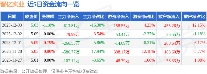 证券之星消息,截至2025年12月3日收盘,晋亿实业(601002)报收于5.03元,下跌1.18%,换手率0.78%,成交量7.43万手,成交额3747.65万元。