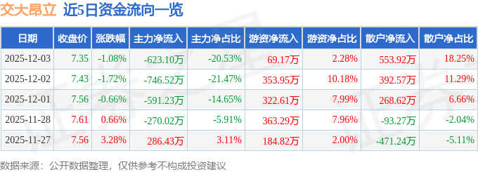 12月3日的资金流向数据方面,主力资金净流出623.1万元,占总成交额20.53%,游资资金净流入69.17万元,占总成交额2.28%,散户资金净流入553.92万元,占总成交额18.25%。