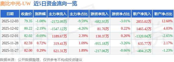 证券之星消息,截至2025年12月3日收盘,奥比中光(688322)报收于79.35元,下跌1.08%,换手率0.97%,成交量2.84万手,成交额2.27亿元。