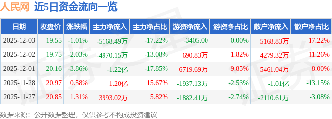 证券之星消息,截至2025年12月3日收盘,人民网(603000)报收于19.55元,下跌1.01%,换手率1.39%,成交量15.36万手,成交额3.0亿元。