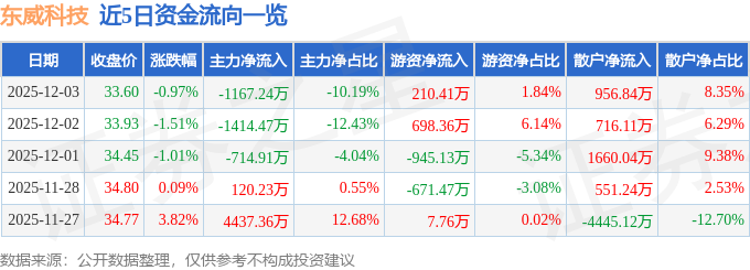 证券之星消息,截至2025年12月3日收盘,东威科技(688700)报收于33.6元,下跌0.97%,换手率1.14%,成交量3.4万手,成交额1.15亿元。
