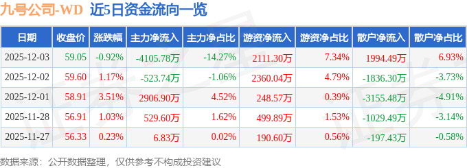 证券之星消息,截至2025年12月3日收盘,九号公司(689009)报收于59.05元,下跌0.92%,换手率0.88%,成交量4.87万手,成交额2.88亿元。