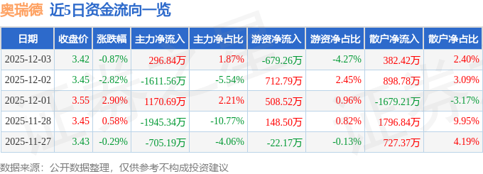 证券之星消息,截至2025年12月3日收盘,奥瑞德(600666)报收于3.42元,下跌0.87%,换手率1.92%,成交量46.57万手,成交额1.59亿元。