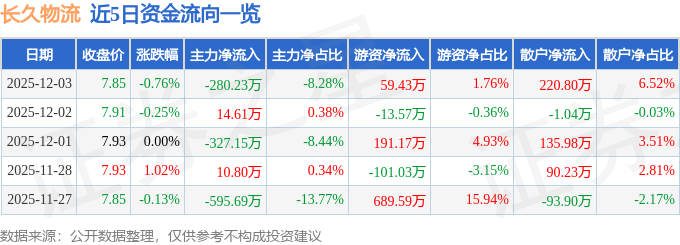 证券之星消息,截至2025年12月3日收盘,长久物流(603569)报收于7.85元,下跌0.76%,换手率0.71%,成交量4.31万手,成交额3384.4万元。