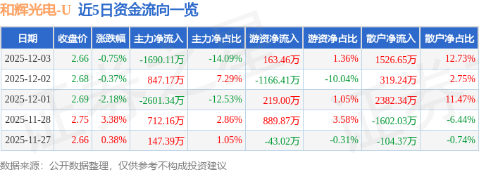 证券之星消息,截至2025年12月3日收盘,和辉光电(688538)报收于2.66元,下跌0.75%,换手率0.78%,成交量45.12万手,成交额1.2亿元。
