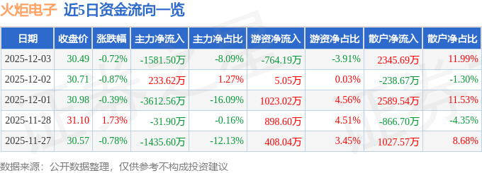 证券之星消息,截至2025年12月3日收盘,火炬电子(603678)报收于30.49元,下跌0.72%,换手率1.35%,成交量6.42万手,成交额1.96亿元。