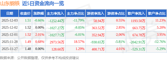 证券之星消息,截至2025年12月3日收盘,山东钢铁(600022)报收于1.51元,下跌0.66%,换手率0.65%,成交量69.98万手,成交额1.06亿元。