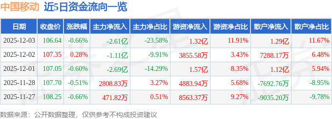 证券之星消息,截至2025年12月3日收盘,中国移动(600941)报收于106.64元,下跌0.66%,换手率1.15%,成交量10.36万手,成交额11.08亿元。