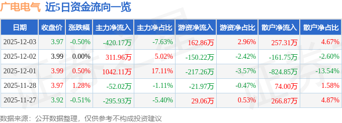 证券之星消息,截至2025年12月3日收盘,广电电气(601616)报收于3.97元,下跌0.5%,换手率1.62%,成交量13.86万手,成交额5508.92万元。