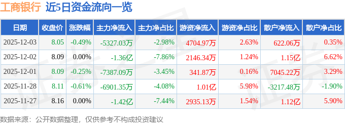 证券之星消息,截至2025年12月3日收盘,工商银行(601398)报收于8.05元,下跌0.49%,换手率0.08%,成交量221.26万手,成交额17.89亿元。
