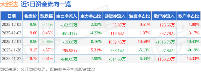 证券之星消息,截至2025年12月3日收盘,大胜达(603687)报收于8.96元,下跌0.44%,换手率1.43%,成交量7.87万手,成交额7017.69万元。