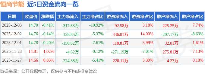 证券之星消息,截至2025年12月3日收盘,恒尚节能(603137)报收于14.7元,下跌0.41%,换手率2.68%,成交量1.98万手,成交额2911.1万元。