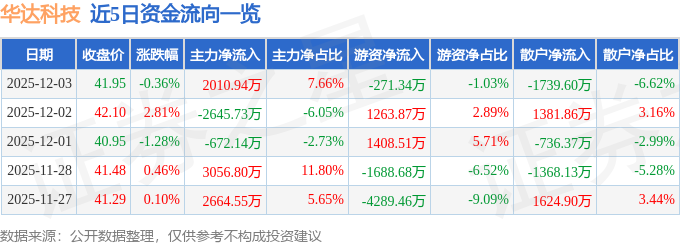 证券之星消息,截至2025年12月3日收盘,华达科技(603358)报收于41.95元,下跌0.36%,换手率1.41%,成交量6.32万手,成交额2.63亿元。