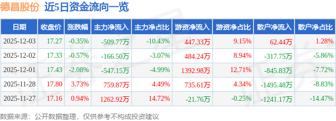 证券之星消息,截至2025年12月3日收盘,德昌股份(605555)报收于17.27元,下跌0.35%,换手率0.58%,成交量2.82万手,成交额4886.68万元。