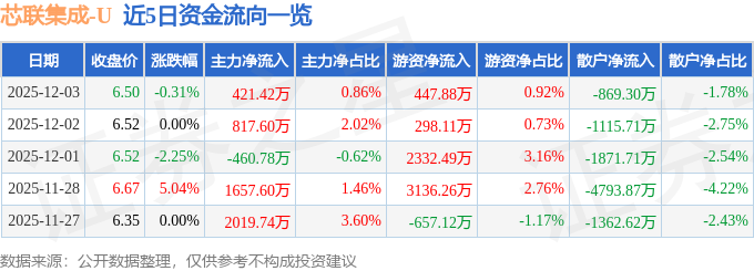 证券之星消息,截至2025年12月3日收盘,芯联集成(688469)报收于6.5元,下跌0.31%,换手率1.69%,成交量74.91万手,成交额4.89亿元。