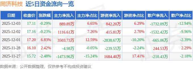 证券之星消息,截至2025年12月3日收盘,同济科技(600846)报收于17.11元,下跌0.29%,换手率1.25%,成交量7.83万手,成交额1.34亿元。
