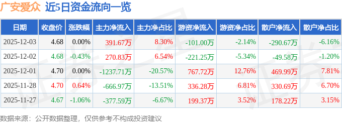 12月3日的资金流向数据方面,主力资金净流入391.67万元,占总成交额8.3%,游资资金净流出101.0万元,占总成交额2.14%,散户资金净流出290.67万元,占总成交额6.16%。