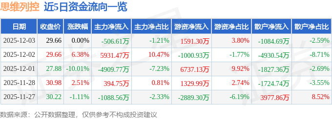 证券之星消息,截至2025年12月3日收盘,思维列控(603508)报收于29.66元,上涨0.0%,换手率3.76%,成交量14.33万手,成交额4.19亿元。