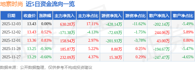 证券之星消息,截至2025年12月3日收盘,地素时尚(603587)报收于13.43元,上涨0.0%,换手率0.58%,成交量2.75万手,成交额3684.03万元。