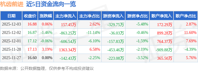 证券之星消息,截至2025年12月3日收盘,杭齿前进(601177)报收于16.88元,上涨0.06%,换手率0.89%,成交量3.57万手,成交额6013.35万元。