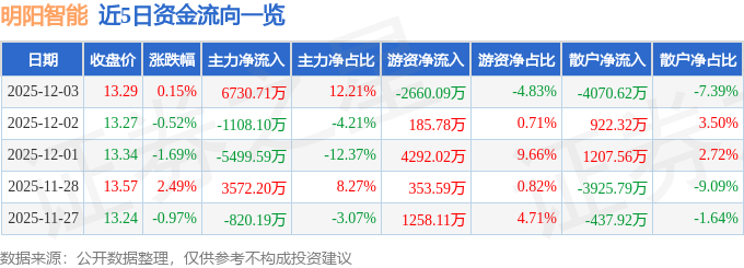 证券之星消息,截至2025年12月3日收盘,明阳智能(601615)报收于13.29元,上涨0.15%,换手率1.82%,成交量41.27万手,成交额5.51亿元。