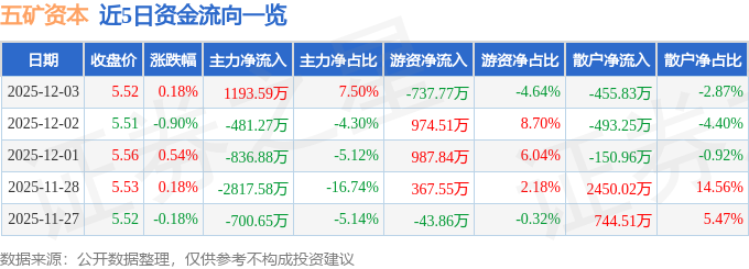 证券之星消息,截至2025年12月3日收盘,五矿资本(600390)报收于5.52元,上涨0.18%,换手率0.64%,成交量28.77万手,成交额1.59亿元。