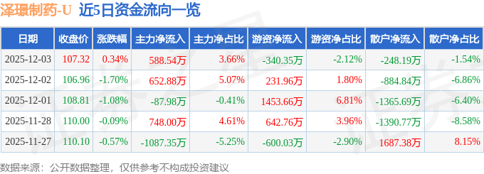 证券之星消息,截至2025年12月3日收盘,泽璟制药(688266)报收于107.32元,上涨0.34%,换手率0.56%,成交量1.49万手,成交额1.61亿元。