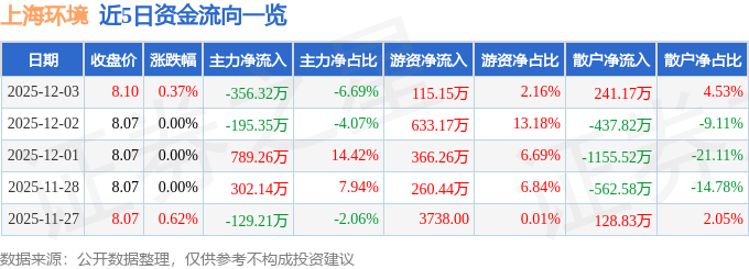 证券之星消息,截至2025年12月3日收盘,上海环境(601200)报收于8.1元,上涨0.37%,换手率0.49%,成交量6.59万手,成交额5322.77万元。