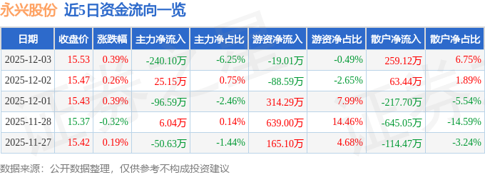 证券之星消息,截至2025年12月3日收盘,永兴股份(601033)报收于15.53元,上涨0.39%,换手率1.03%,成交量2.48万手,成交额3840.93万元。