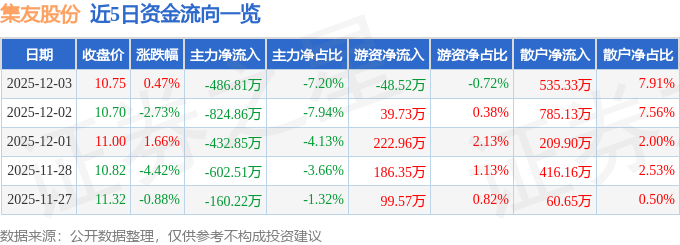 12月3日的资金流向数据方面,主力资金净流出486.81万元,占总成交额7.2%,游资资金净流出48.52万元,占总成交额0.72%,散户资金净流入535.33万元,占总成交额7.91%。