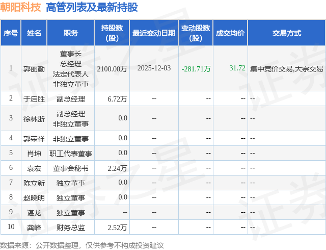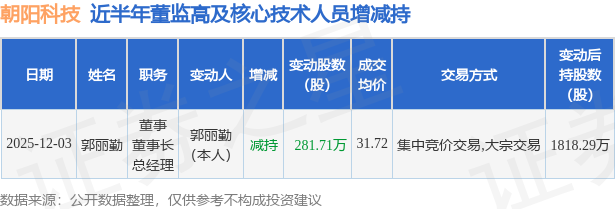 朝阳科技近半年内的董监高及核心技术人员增减持详情如下: