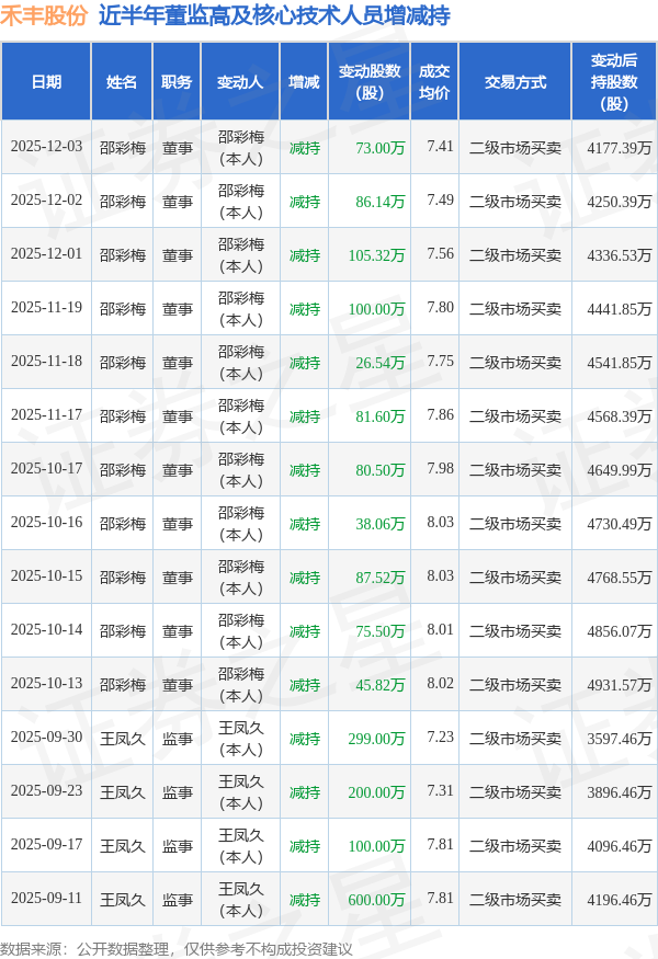 禾丰股份近半年内的董监高及核心技术人员增减持详情如下: