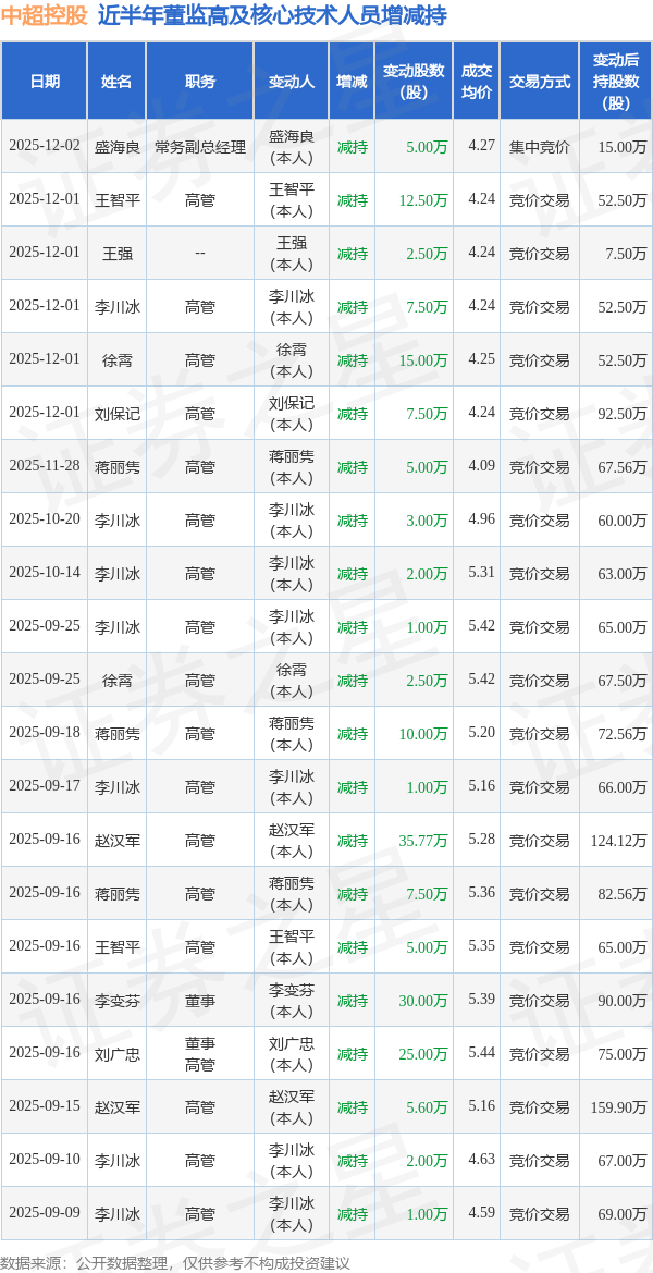 中超控股近半年内的董监高及核心技术人员增减持详情如下: