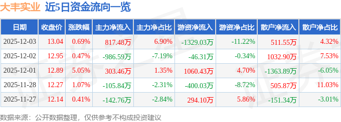 证券之星消息,截至2025年12月3日收盘,大丰实业(603081)报收于13.04元,上涨0.69%,换手率2.16%,成交量9.13万手,成交额1.18亿元。