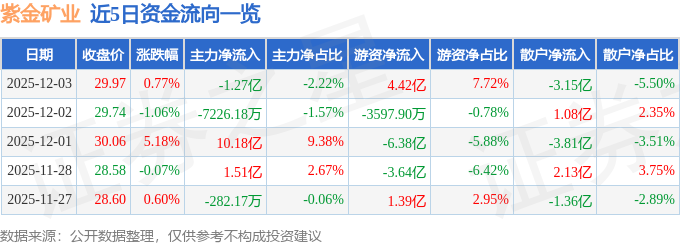 证券之星消息,截至2025年12月3日收盘,紫金矿业(601899)报收于29.97元,上涨0.77%,换手率0.93%,成交量191.13万手,成交额57.31亿元。