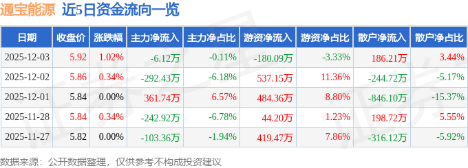 证券之星消息,截至2025年12月3日收盘,通宝能源(600780)报收于5.92元,上涨1.02%,换手率0.8%,成交量9.17万手,成交额5406.71万元。