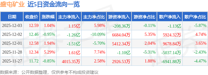 证券之星消息,截至2025年12月3日收盘,盛屯矿业(600711)报收于12.59元,上涨1.04%,换手率4.95%,成交量153.09万手,成交额19.3亿元。